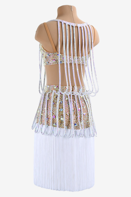 Permino white Latin dress with beaded fringe, stone fringes and AB stone